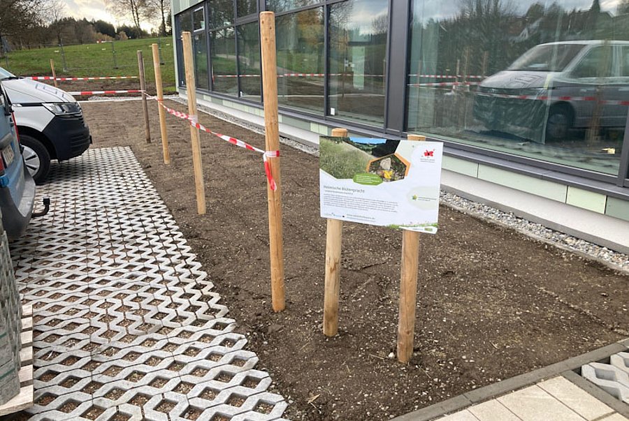 Der LPV hat im Sommer letzten Jahres artenreiche Wiesen am Bergfriedhof der Stadt mit einer Bürstmaschine beerntet, das Saatgut getrocknet und für eine Ansaat aufbereitet. Diese Wiesen des Bergfriedhofs werden seit vielen Jahren nicht gedüngt und weisen ein hohes Artenspektrum auf. Auf die Fläche am Hallenbad wurde zunächst mageres, kiesiges Substrat ausgebracht und anschließend das gebietseigene Samenmaterial ausgebracht. Bauhofmitarbeiter walzten die Fläche für einen besseren Bodenschluss der Samen und sperrten die Fläche ab. Ein Schild weist zudem auf das Projekt hin. Langfristig soll die Fläche zwei Mal pro Jahr mit einem Balkenmäher gemäht werden. Nun bleibt abzuwarten, wie sich die Fläche in den kommenden Jahren entwickelt.